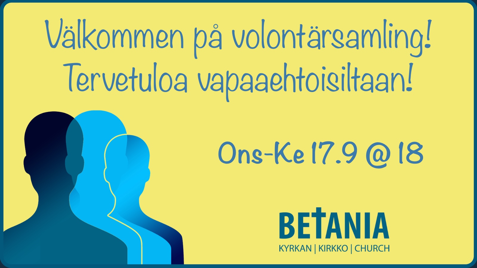 Tackfest för alla volontärer, medarbetare, ansvariga och anställda! Du som är med i någon grupp och verksamhet är härmed kallad till höstens första medarbetarsamling på onsdag 17 september kl. 18 i Betania
