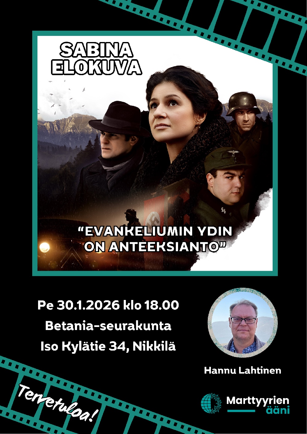 Perjantaina 30.1. klo 18 on Betaniassa luvassa erityinen ilta: Betania saa vieraakseen Hannu Lahtisen, joka esittää elokuvan “Sabina”. Elokuva perustuu Sabina ja Richard Wurmbrandin kamppailuun elämän ja rakkauden puolesta keskellä sodan kauhuja Bukarestissa. Sodan jälkeen he jatkoivat työtään vainottujen kristittyjen hyväksi perustamansa ”Marttyyrien ääni” -järjestön kautta. Elokuva ei sovellu alle 13-vuotiaille lapsille. Englanninkielinen puhe, suomenkielinen tekstitys.