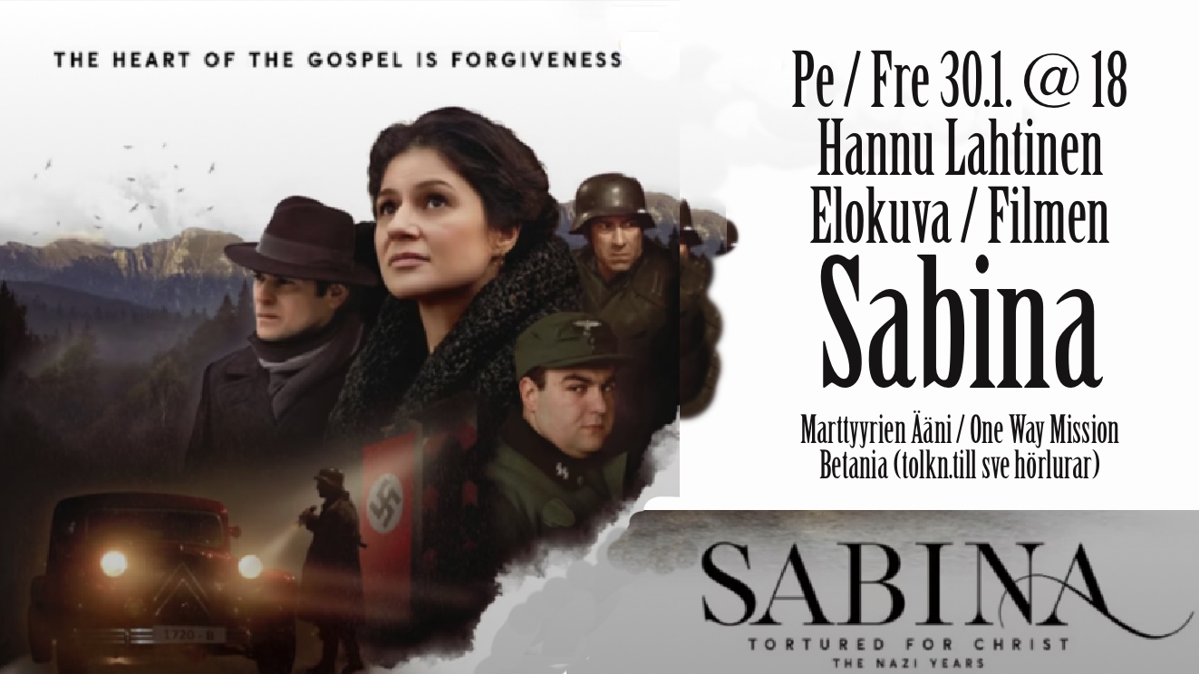 En speciell kväll i Betania blir det fredagen den 30.1. kl. 18: Då får Betania besök av Hannu Lahtinen (Marttyyrien Ääni ry) som visar filmen “Sabina”. Filmen baseras på Sabina och Richard Wurmbrands kamp för livet och kärleken mitt under krigets fasor i Bukarest. De fortsatte sedan efter kriget att kämpa för förföljda kristna genom organisationen “Martyrernas röst” som de grundade. Filmen lämpar sig inte för barn under 13 år. Engelskt tal och finsk text. Arrangeras tillsammans med One Way Mission och Martyrernas Röst Finland rf. Samlingen går på finska, tolkning till svenska vid behov via hörlurar. Kollekt till stöd för arbetet som Martyrernas röst rf utför.