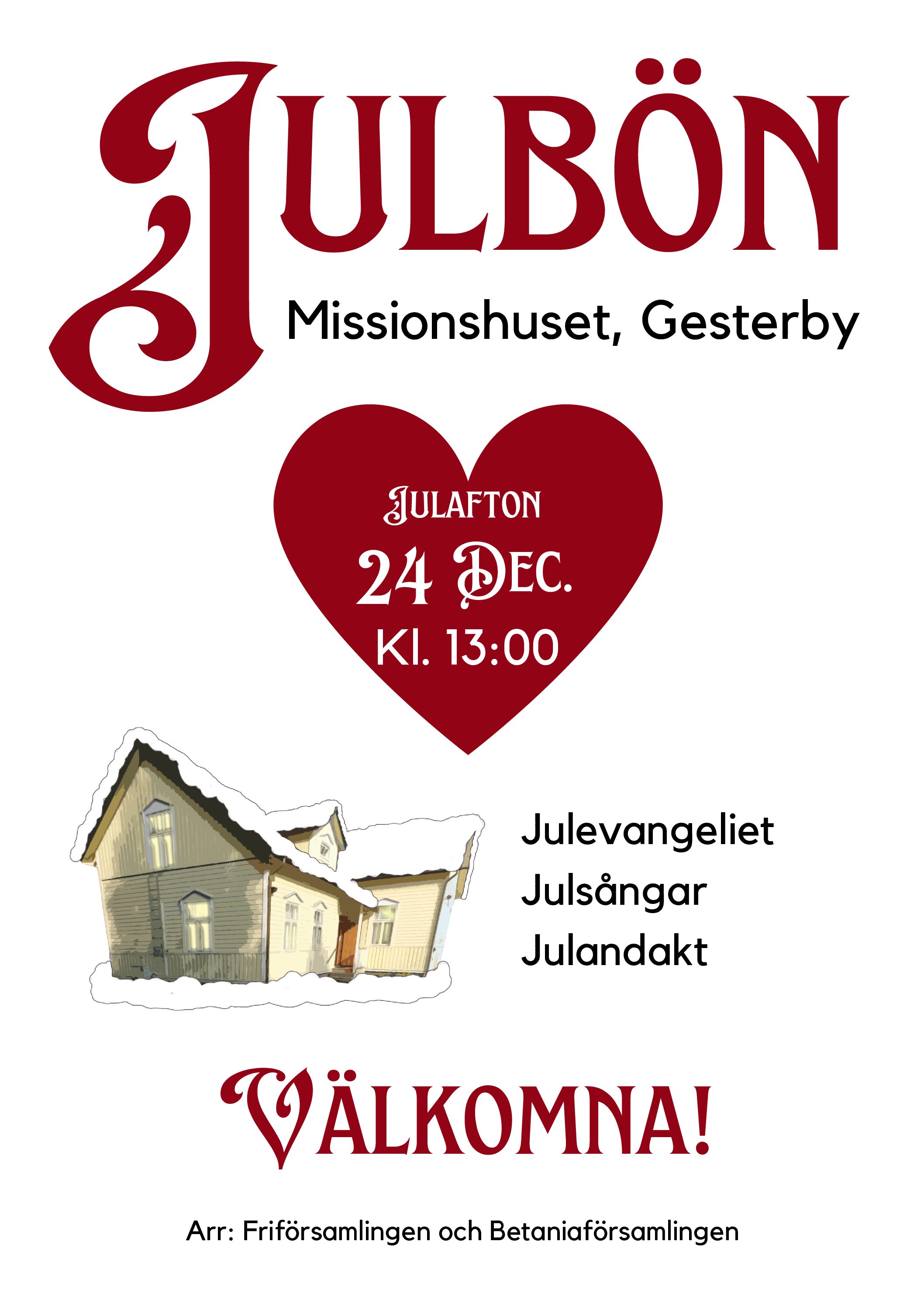 Välkommen till vår stämningsfulla JULBÖN i Gesterby Missionshus på julafton 24 december kl. 13! Även i år är det ett gemensamt arrangemang tillsammans med Friförsamlingen.