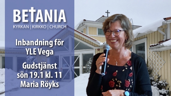 Följande söndag, den 19.1 kl. 11, bandar vi in gudstjänsten för YLE Vega. Gudstjänsten blir därför kortare än vanligt, och vi ber alla komma i god tid så vi inte har onödigt spring då vi ska börja inbandningen. Det blir predikan av Maria Röyks. Filip Levälahti, Michael Söderlund m.fl leder sången och musiken. Gabriel Grönroos är mötesledare.
