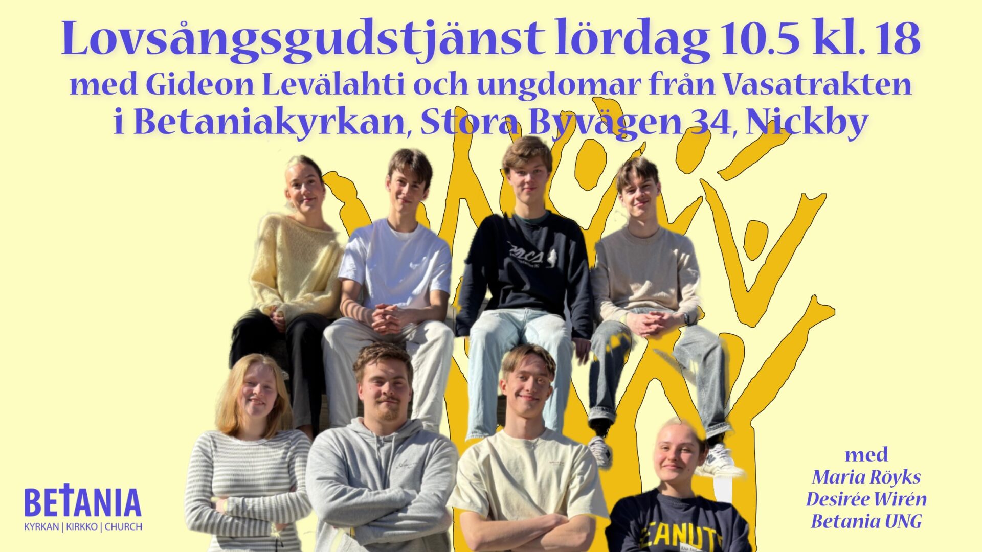 Vi har ingen gudstjänst på söndag, lördagens lovsångsgudstjänst ersätter söndagsmötet. Så boka in lördagskvällen för en lovsångsfylld gudstjänst, där också Maria Röyks, Desirée Wirén och Betania UNG medverkar.