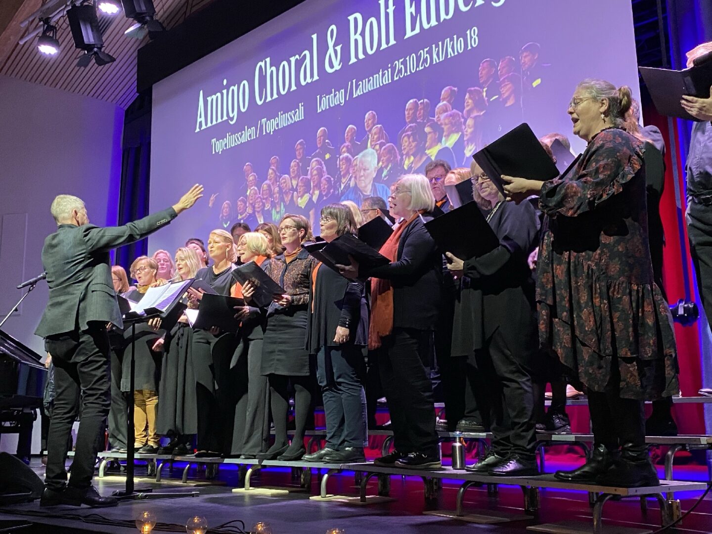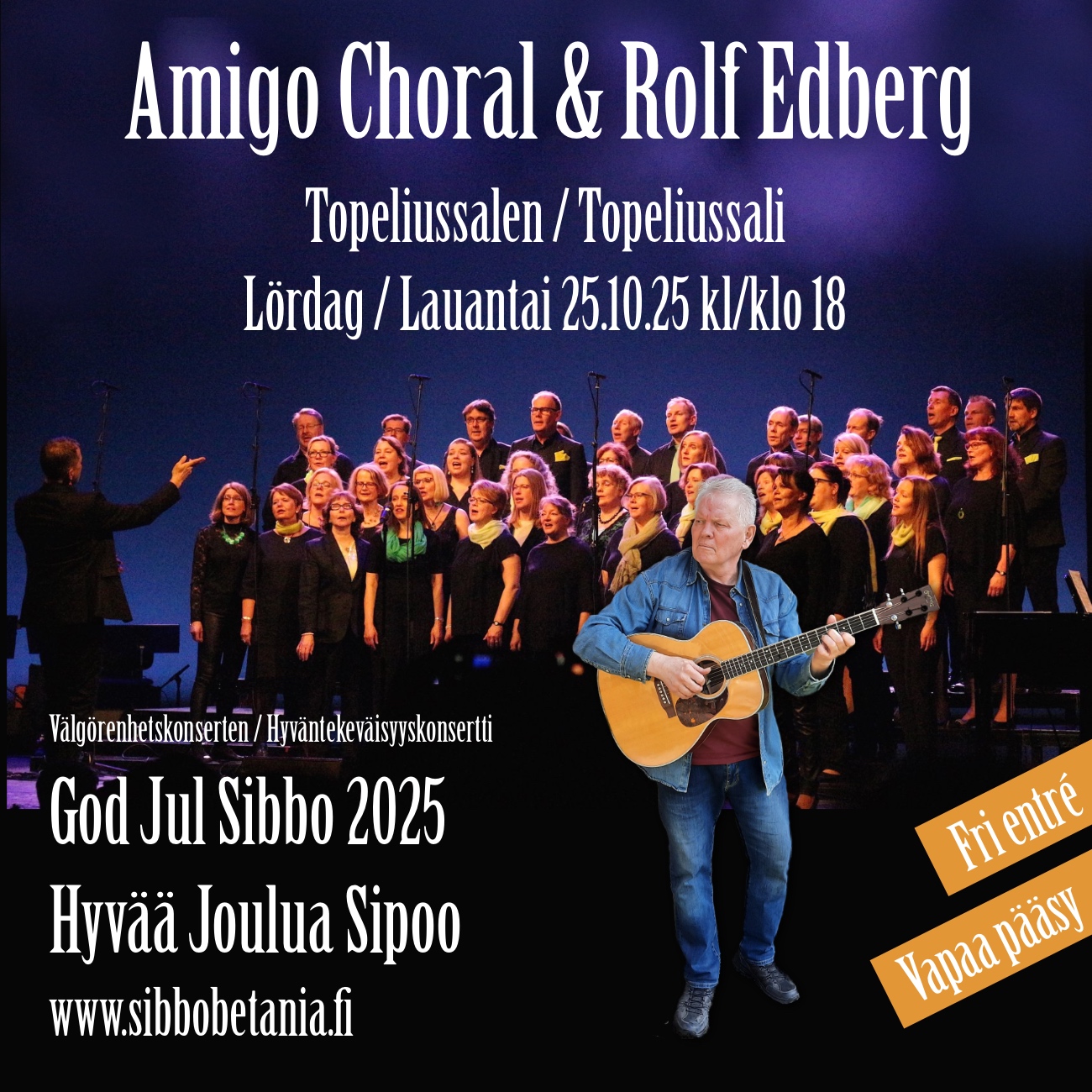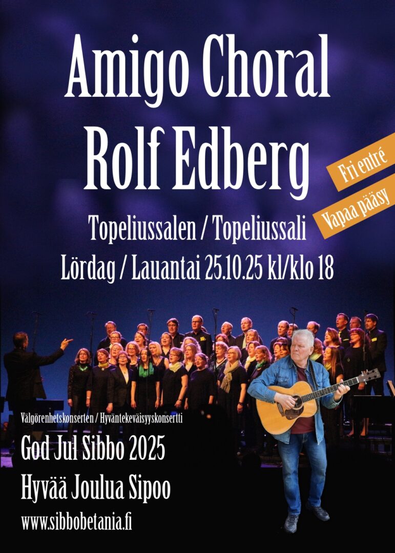 I konserten sjöng kören Amigo Choral och trubaduren Rolf Edberg. Även i år samlar Betaniaförsamlingen pengar för att kunna hjälpa utsatta familjer och barn i Sibbo inför julen. Under konserten kunde du bidra med kontanter. Men du kan ge din gåva när som helst* via bankkontot eller MobilePay, och insamlingen fortsätter till 14.12.