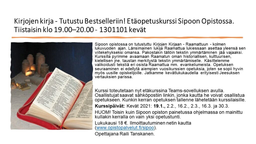 Koko Raamattu, Jumalan Sana on annettu ihmiselle elämäksi. Näin Jumala ilmoitti vakuuttavasti sekä Mooseksen (“sana … siinä on teidän elämänne”, V Ms 32:47) että Jeesuksen kautta. (“Ne sanat, jotka minä olen teille puhunut, ovat henki ja ovat elämä.” Joh 6: 63). Ei ihme, että opetuslasten sydämessä syttyi usko ja elämä, kun he Emmauksen tiellä epäilyksin joutuneina kuuntelivat, kuinka Jeesus selitti heille kirjoituksia. (Lk 24:32). Tätä mekin rukoilemme tapahtuvaksi kokoontuessamme Sanan äärelle, sen aarteita etsimään.