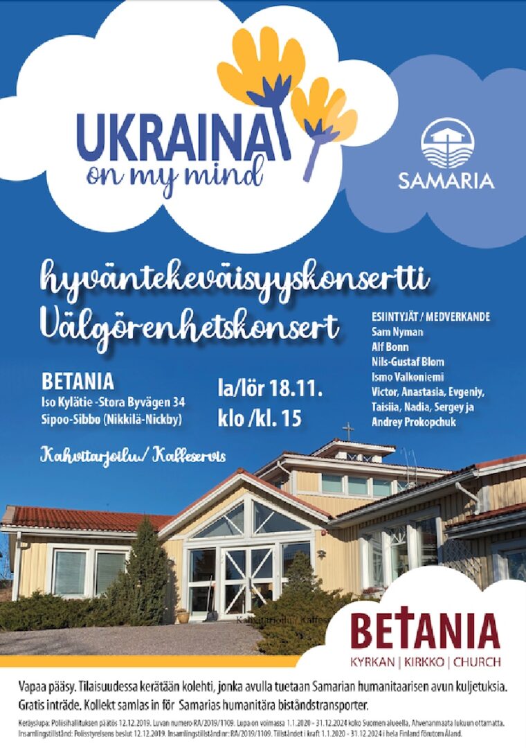 Samaria rf och Betania samarbetade kring den här konserten för att aktualisera behovet av hjälp i Ukraina. Samaria har under kriget skickat ner många hjälpsändningar – 22 resor såhär långt. Många enskilda och organisationer har bidragit, men det behövs mer. Konsertens behållning går till att stöda det här hjälparbetet. Mer info under konserten.